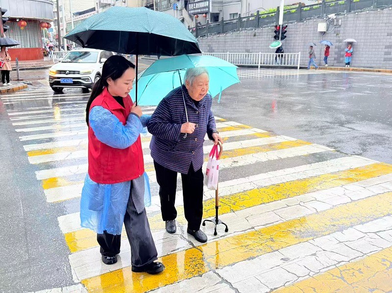 在城关镇的多个主要路口,身穿红色志愿马甲的志愿者们成为雨天里的一道温暖风景线。九里岗桥十字路口,一位志愿者撑着雨伞,悉心搀扶着拄拐杖的老人在斑马线上有序通行,为老人遮挡风雨的同时,也守护着她的出行安全。