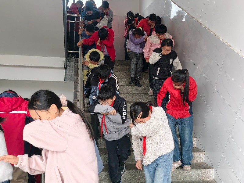 9时55分,消防警报准时拉响,演练正式启动。各班学生在班主任及任课教师的指挥下,弯腰捂鼻、压低身姿,严格依照预定路线快速、有序撤离,全程无拥挤、无推搡、无滞留,师生沉着应对、配合默契,展现出良好的安全素养与应急协作能力,顺利抵达操场指定安全区域。