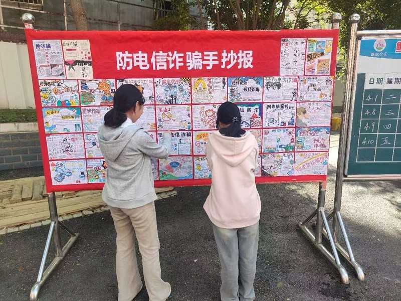 活动中,学生创作的防诈手抄报整齐展出,围绕刷单返利、校园贷等常见诈骗类型,以案例拆解诈骗套路,传递“不轻信、不透露、不转账”的反诈理念,让师生在观赏交流中掌握防诈技巧。