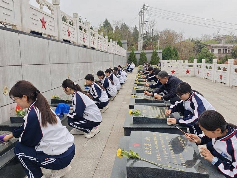 在烈士集中安葬墓区里,大家怀着崇敬的心情为烈士墓碑“描红”,给英烈名字“上色”。认真擦拭每座烈士墓碑,分散开来或站立、或半蹲,认真地一笔一画、一丝不苟地描摹烈士英名,经过大家的努力,烈士集中安葬墓区墓碑上的字迹焕然一新。优秀学生代表王心宇说“通过擦拭墓碑,给烈士描红,我真切感受到了革命先烈的坚定信念和无私奉献的精神。今后会更加珍惜当下,努力学习,用实际行动传承红色血脉,扛起新时代青年的担当与使命。”