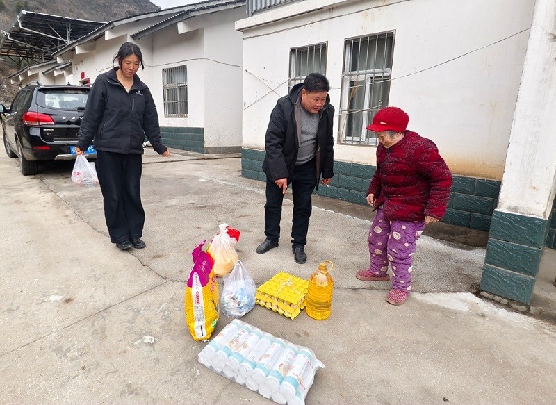 3月2日上午,春寒料峭。城关镇罐沟村的村干部和驻村干部驱车来到村民孙奶奶家,村书记张林平为老人送来了米面粮油、鸡蛋食盐等物品,村干部陈玉华为老人拿来了鱼肉和牛肉。