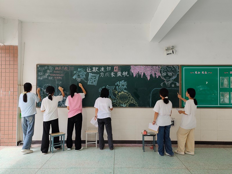 同时,学校升旗广场等公共区域的大屏幕持续滚动播放防欺凌主题宣传片,以真实场景、法律解读和温暖故事,直观展现校园欺凌的危害,引导师生对欺凌行为保持“零容忍”态度,鼓励大家主动向不文明现象说“不”。各年级也积极响应,组织学生创作防欺凌主题黑板报,同学们以画笔和文字为载体,将对欺凌的认知、对和谐校园的期盼融入版面设计,营造出“反欺凌、护同伴”的班级氛围。